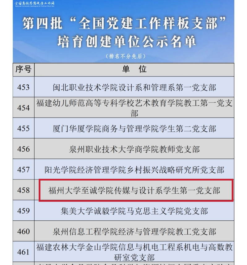 日前,教育部公示了第四批新时代高校党建示范创建和质量创优工作遴选结果,我院传媒与设计系学生第一党支部入选“全国党建工作样板支部”培育创建单位。这是我院获批的第三个全国党建工作样板党支部。