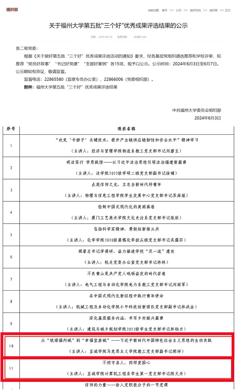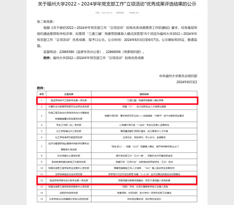 日前,av在线看 党委公示《av在线看 第五批“三个好”优秀成果评选结果》和《av在线看 2022~2024学年党支部工作“立项活动”优秀成果评选结果》,我院有4项成果入选优秀成果,是历年来最好成绩。