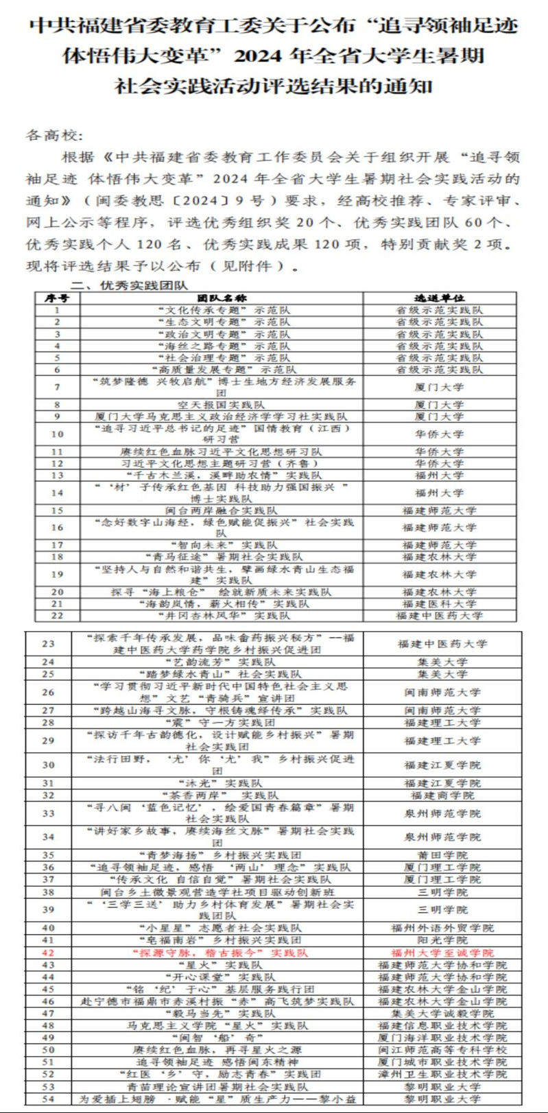 日前,中共福建省委教育工委公布了“追寻领袖足迹 体悟伟大变革”2024年全省大学生暑期社会实践活动评选结果。经高校推荐、专家评审、网上公示等程序,评选产生了优秀组织奖20个、优秀实践团队60个、优秀实践个人120名、优秀实践成果120项、特别贡献奖2项。我院“探源守脉,稽古振今”实践队成功在活动中获评优秀实践团队。