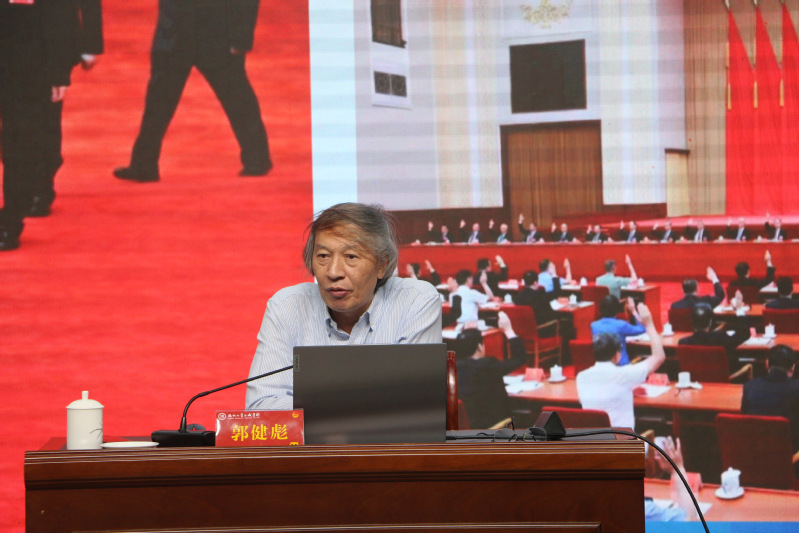 随后,福建江夏学院马克思主义学院首任院长、福建省高校思政课教学指导委员会委员、福建省社科联“东南周末讲坛十佳(红色)宣讲人”郭健彪教授为青马班学员带来了题为《当前中国面临的国际形势分析》的开班第一讲。郭健彪教授用丰富的案例从“百年变局:复杂多端的国际局势”“大国关系:诠释的参考点”“中国发展:现代化的世界意义”等三个方面带领师生深入认识当前国际社会正经历的深刻变革和我国面临的国际形势,了解影响全球稳定发展的大国关系因素,以及中国在现代化进程中的全球影响,让与会师生明确中国在国际上展现的大国风范和原则立场。最后,郭健彪教授勉励在场学生要正确的认识我国所处的历史方位,在党的全面领导下,坚定中国特色社会主义道路自信,以日益精深的专业水平、守正创新的思维能力、矢志不渝的理想信念为中国式现代化贡献出属于自己的青春力量。