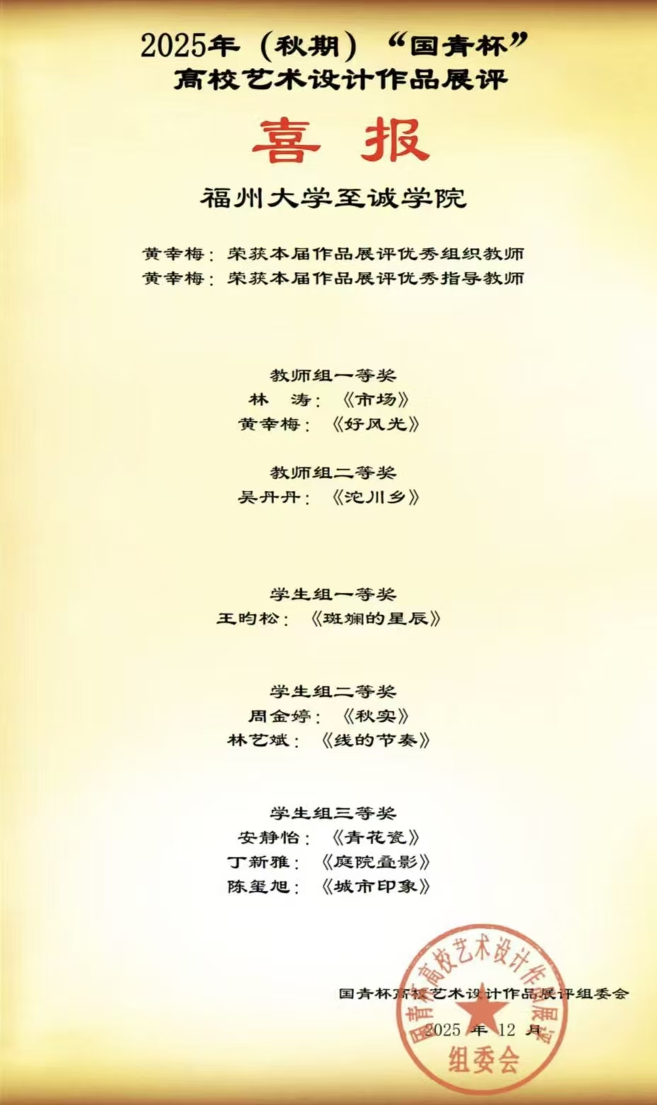 近日,在2025年(秋期)“国青杯”高校艺术设计作品展评中,av在线看 建筑系师生凭借扎实的专业功底与出色的综合能力脱颖而出,最终斩获2项一等奖、3项二等奖、3项全国三等奖,充分展现了至诚学子的风采。
