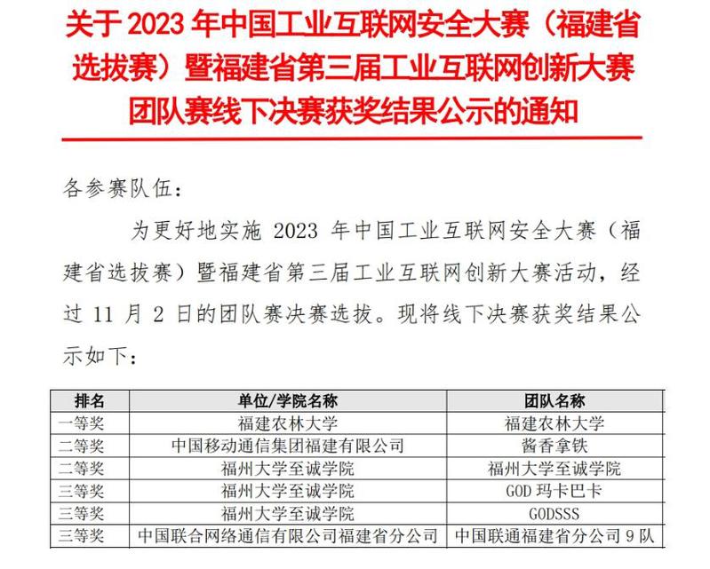 据悉,该项赛事由福建省工业和信息化厅、福建省教育厅、福建省总工会、共青团福建省委、福建省通信管理局联合发起并主办,是面向省内工业互联网安全技术领域具有一定经历的相关企业、高校(含技工院校)在职人员以及全日制学生的高层次高水平竞赛,我院战队与来自厦门大学、农林大学、福建师范大学等高校以及中国移动、中国联通等企业同赛道竞技,最终斩获3个奖项(该赛道共设一等奖1项,二等奖2项,三等奖3项)。